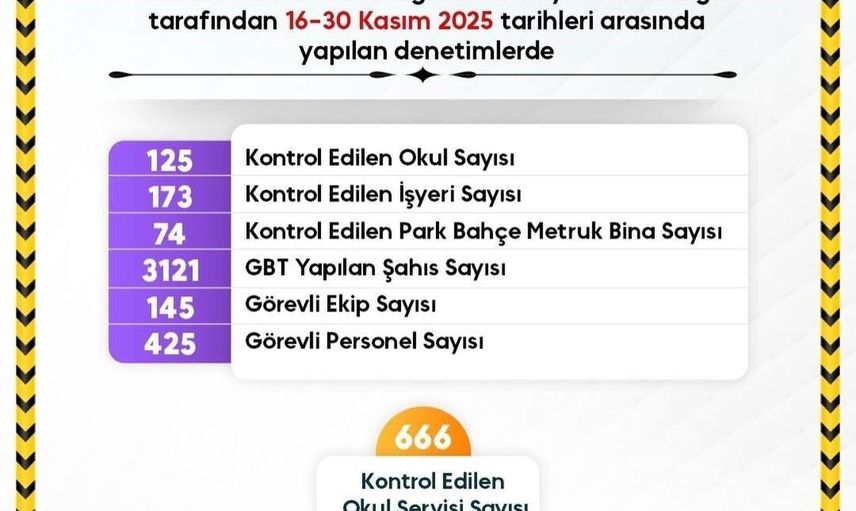 16-30 Kasım 2025 tarihleri arasında gerçekleştirilen denetimlerde 125 okul, 173 iş yeri ve 74 park, bahçe ve metruk bina kontrol edildi. Kimlik sorgulaması kapsamında 3.121 kişi hakkında GBT taraması yapıldı. Denetimlerde 145 ekip ve 425 personel görev aldı.
