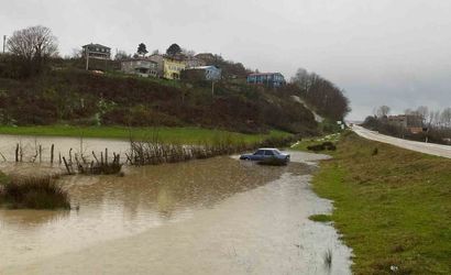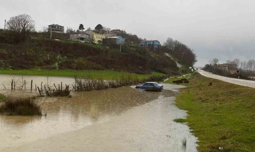 Sinop’ta, sağanak yağışın ardından yolda oluşan su birikintisine giren bir otomobil, sürücüsünün direksiyon hakimiyetini kaybetmesi sonucu şarampole düşerek suyun içine saplandı.
