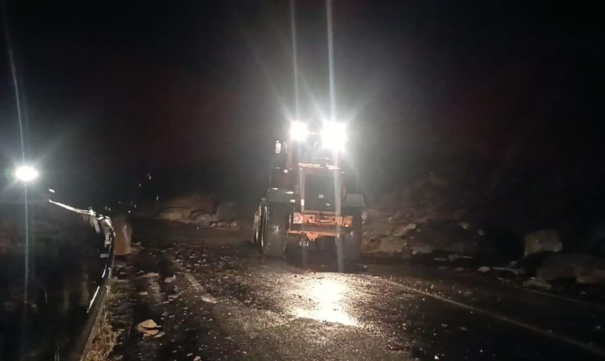 Şırnak’ın Uludere ilçesine bağlı Haburiki köyü yakınlarındaki Komato bölgesinde, dün akşam etkili olan şiddetli yağış nedeniyle dağdan kopan büyük kaya parçaları karayolunu trafiğe kapattı.