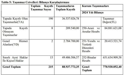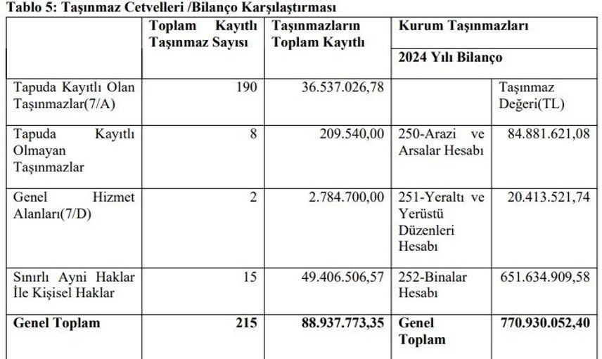 Denetim raporuna göre, üniversitenin Kamu İdarelerine Ait Taşınmazların Kaydına İlişkin Yönetmelik kurallarına uyulmadığı belirtildi. 2024 yılı bilançosunda toplam taşınmaz değeri 770 milyon 930 bin 52 lira olarak gösterilirken, İcmal cetvellerinde bu rakam sadece 88 milyon 937 bin 773 lira olarak kaydedildi. Dolayısıyla, kayıtlar arasında yaklaşık 682 milyon liralık bir uyumsuzluk tespit edildi.