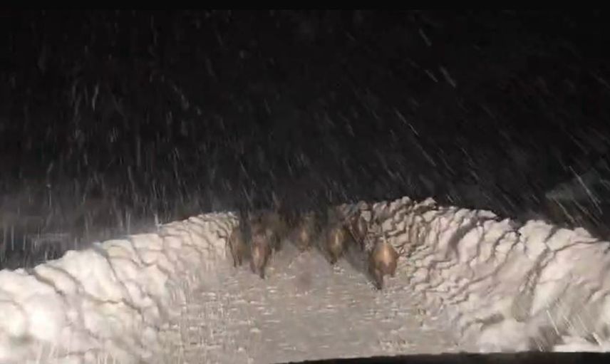 O anlar cep telefonu kamerasına kaydedildi. Görüntülerde, karlı zeminde ilerleyen domuzların ekiplerin önünden geçtiği; bir görevlinin koşarak onlara "yol verin" diye seslendiği anlar yer alıyor.