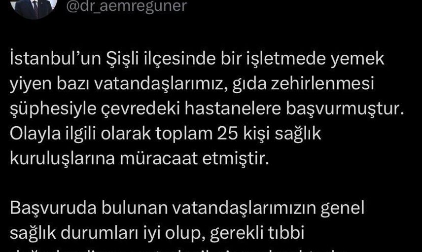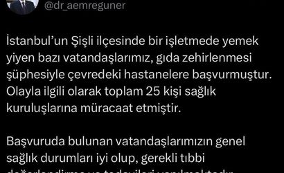 Güner, yaptığı yazılı açıklamada: "İstanbul’un Şişli ilçesinde bir işletmede yemek yiyen bazı vatandaşlarımız, gıda zehirlenmesi şüphesiyle çevredeki hastanelere başvurmuştur. Olayla ilgili olarak toplam 25 kişi sağlık kuruluşlarına müracaat etmiştir. Başvuruda bulunan vatandaşlarımızın genel sağlık durumları iyi olup, gerekli tıbbi değerlendirme ve tedavileri yapılmaktadır" ifadelerini kullandı.