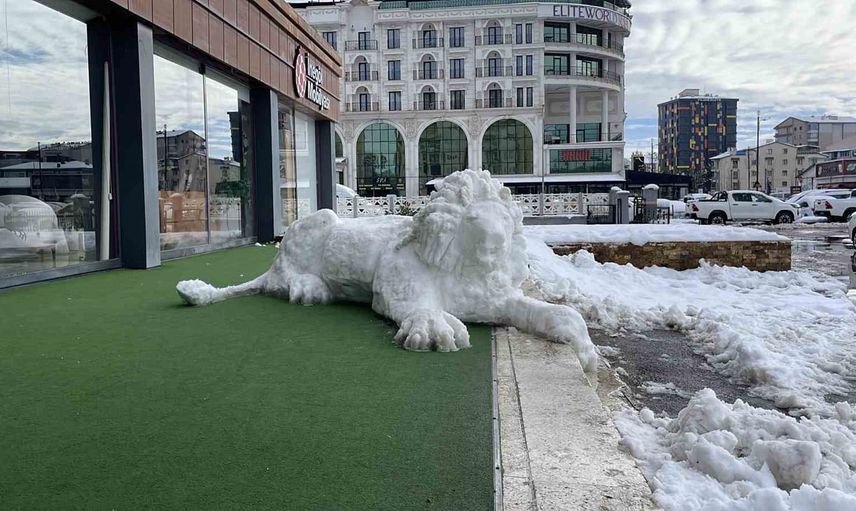 Yerel halkın ilgisini çeken kardan aslan, detaylara verilen özen sayesinde görenlerde hayranlık uyandırıyor.