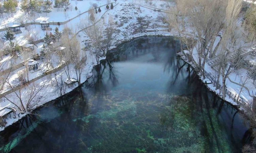 Suya dair ne varsa donduğu Sivas’ta, tek istisna Gürün ilçesindeki Gökpınar Gölü oldu. Turkuaz rengiyle bilinen ve bozkırın nazar boncuğu olarak anılan göl, yüzeydeki buzlanmaya izin vermiyor; aksine çevresine buharını salıyor.
