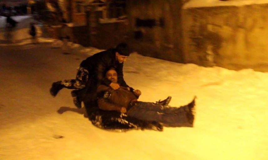 Mahalle sakinleri ısınmak için ateş yakarken bir yandan da ellerindeki tepsiler ve plastik şişelerle kaydı. İlçede süren bu kar eğlencesi gecenin ilerleyen saatlerine kadar devam etti.