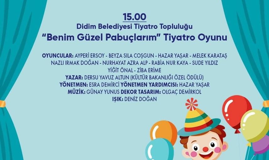 17 Ocak Cumartesi günü DİGEM’de saat 13.30'da Bubble Show, ardından saat 15.00'te Didim Belediyesi Tiyatro Topluluğu tarafından sahnelenen 'Benim Güzel Pabuçlarım' oyunu izleyicilerle buluşacak.