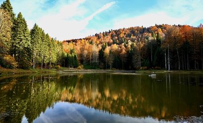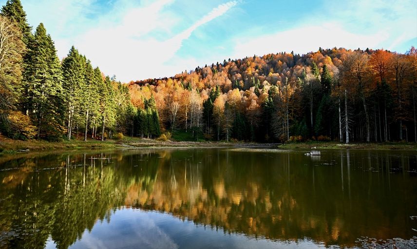 Düzce'deki Odayeri Yaylası ve Torkul Göleti, yeşil, sarı, kızıl ve kahverengi tonlara bürünen ağaçlarıyla misafirlerine sonbahar manzaraları sunuyor.