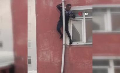 Yangın esnasında dairede ailesiyle birlikte yaşayan yabancı uyruklu bir adam, alevlerden kurtulmaya çalışırken çatıdaki su borusuna tutunarak aşağı düştü. O anlar güvenlik kamerası kayıtlarına yansıdı.