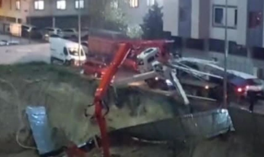 Sultangazi’de inşaat alanında toprak kaydı beton pompası yan yattı