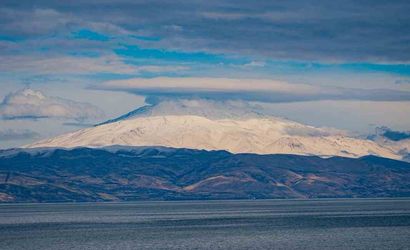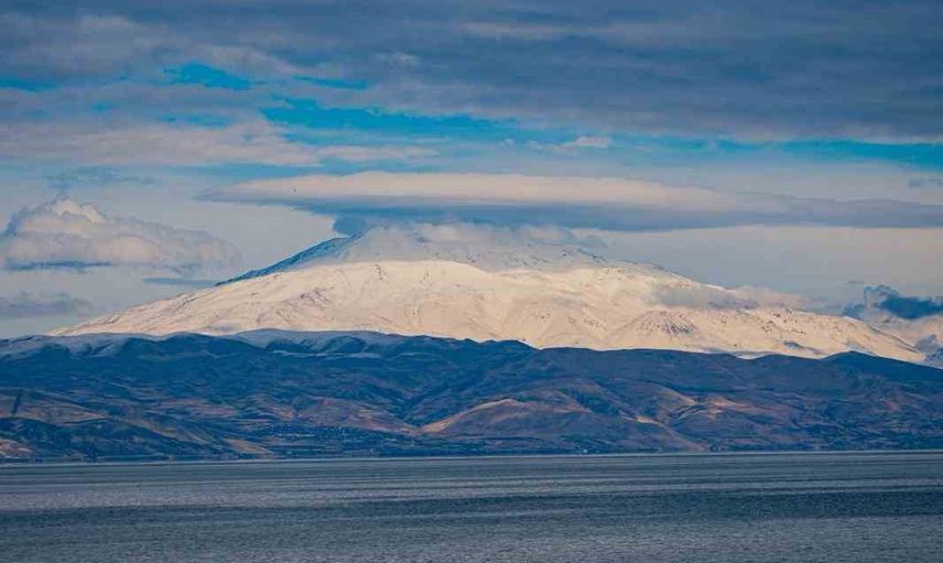 Bitlis’in Adilcevaz ilçesinde yer alan ve 4 bin 58 metre yüksekliğiyle bölgenin en görkemli dağlarından biri olan Süphan Dağının karlı tepesi, şapka görünümünde bir mercek bulutu ile kaplandı.