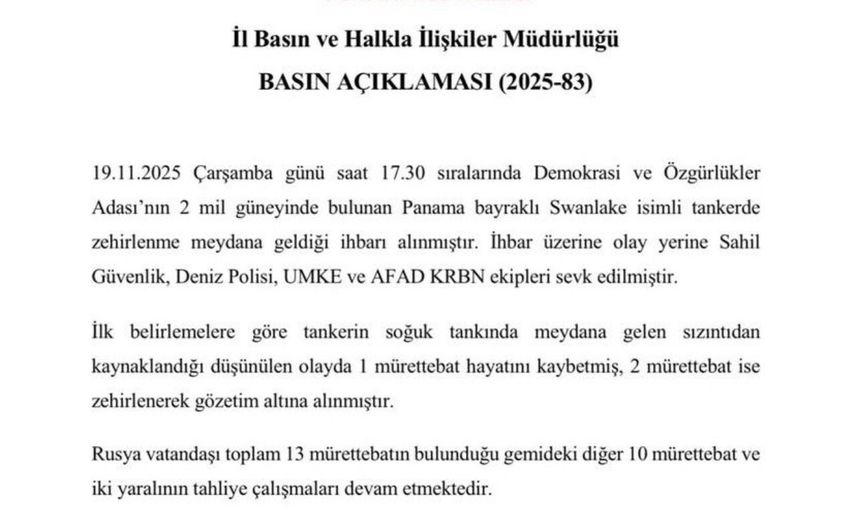 Demokrasi ve Özgürlükler Adası’nın yaklaşık 2 mil güneyinde demirli bulunan Panama bayraklı Swanlake isimli tanker gemisinde zehirlenme vakası meydana geldi. Olayda 1 mürettebat hayatını kaybetti, 2 mürettebat zehirlenme nedeniyle hastaneye kaldırılarak gözetim altına alındı. Gemide toplam 13 mürettebat bulunuyordu.