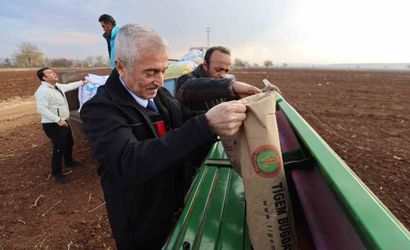 Şahinbey Belediye Başkanı Mehmet Tahmazoğlu, üretimi artırmak ve çiftçileri desteklemek amacıyla belediyenin dağıttığı buğday ve arpa tohumları ile gübreleri Mülk Köyündeki çiftçilerle birlikte toprağa verdi.