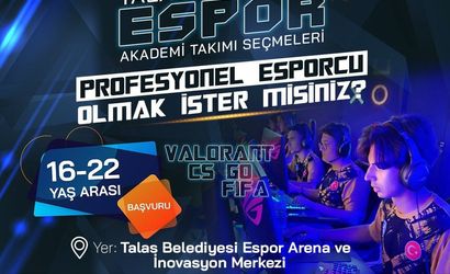 Talas Belediyesi, dijital spor alanında gençlere yeni fırsatlar sunuyor. 16-22 yaş arası adayların katılacağı seçmelerde Valorant, CS GO ve FIFA branşlarında yetenek değerlendirmesi yapılacak.