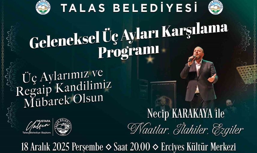 Talas Belediyesi, rahmet, bereket ve arınma mevsimi olarak kabul edilen mübarek üç ayların başlangıcını geleneksel bir programla karşılıyor. Regaip Kandili'nin manevi iklimiyle şekillenen etkinlik, Talaslıları ortak duyguda buluşturmayı amaçlıyor.