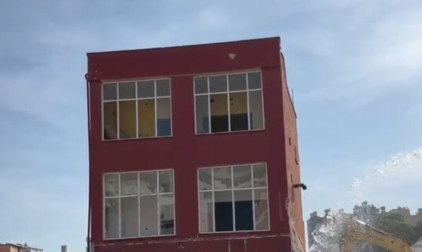 Kontroller ve gerekli güvenlik önlemleri alındıktan sonra, yıkım için gelen iş makinesi operatörü binaya doğrudan temas etmeden, kırıcıyı zemine vurmak suretiyle oluşturduğu titreşimle binanın çökmesini sağladı. Bu yöntemle gerçekleştirilen yıkım sırasında yoğun toz bulutları meydana geldi.
