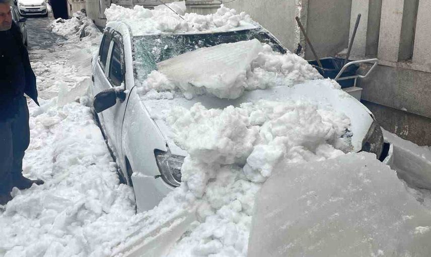 Çatıda biriken kar kütlesi aracın üzerine kaydı; can kaybı yaşanmadı