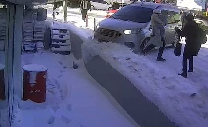 Kayan araç, yolda çocukla birlikte yürüyen iki kadına doğru savruldu. Kadın ve kucağındaki bebek, son anda araç altında kalmaktan kurtuldu. Araç yol kenarına çıkarak binanın bodrum katındaki iş yerlerine girmek üzereyken askıda kaldı.