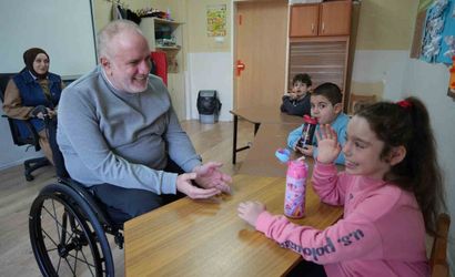 Tekerlekli sandalyeli rehber öğretmen, özel gereksinimli öğrencilere rehberlik ediyor