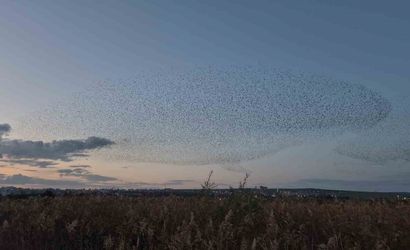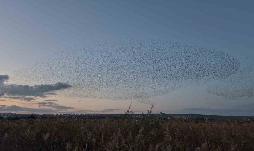 Tekirdağ Süleymanpaşa ilçesinde akşam saatlerinde bir araya gelen yüz binlerce sığırcığın gökyüzünde oluşturduğu toplu uçuş, izleyenlere benzersiz görüntüler sundu.