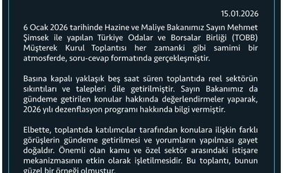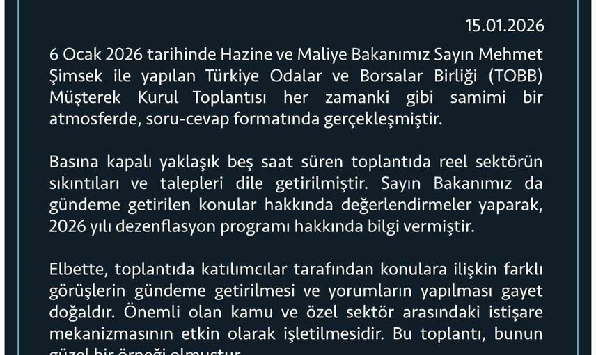 Türkiye Odalar ve Borsalar Birliği (TOBB), Hazine ve Maliye Bakanı Mehmet Şimşek ile 6 Ocak'ta gerçekleştirilen Müşterek Kurul Toplantısı hakkında bilgilendirme yayımladı.