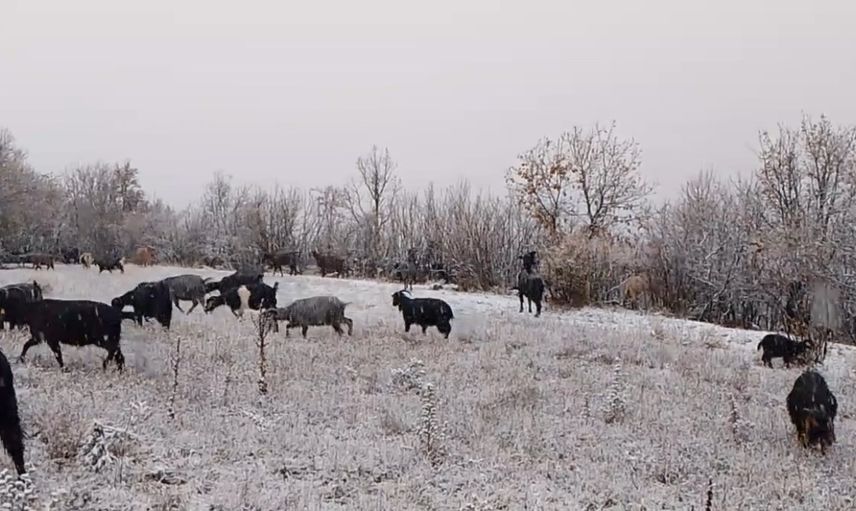 Serhan Çakmak konuyla ilgili, "Şuan 14 Kasım 2025. Reşadiye ilçesi Çamlıkaya köyündeyiz. Hayvanlarımızı kar yağışına rağmen otlatmaya çalışıyoruz" dedi.