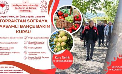 Melikgazi İlçe Tarım ve Orman Müdürlüğü tarafından düzenlenen 'Topraktan Sofraya Kapsamlı Bahçe Bakım Kursu' 09-13 Şubat tarihlerinde İl Tarım ve Orman Müdürlüğü Toplantı Salonu'nda gerçekleştirilecek. Başvuruların son günü 30 Ocak olarak açıklandı.