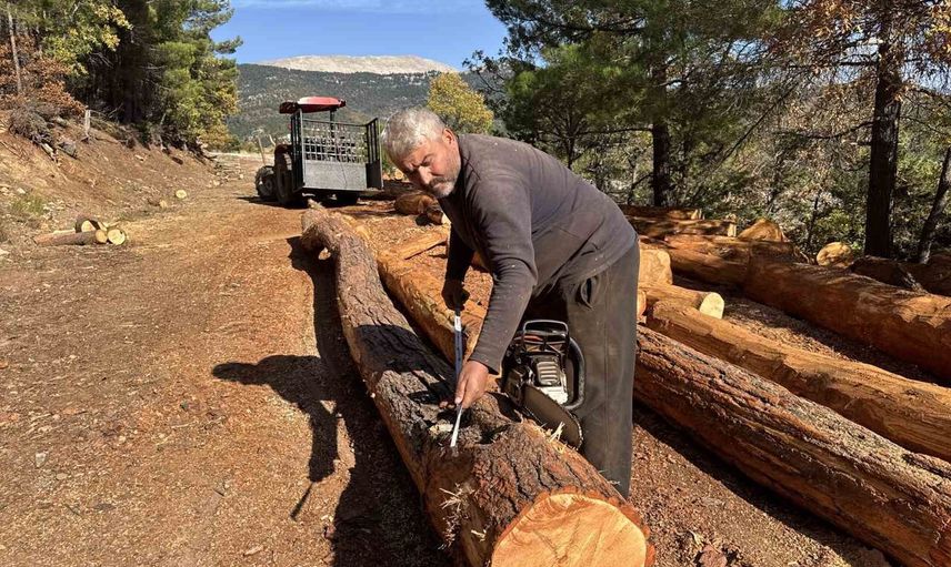 Mehmet Güneş, Akseki Orman İşletme Müdürlüğü tarafından damgalanan ağaçları kesiyor, tomrukları traktörle yol kenarına indiriyor. Burada eşi Esengül Güneş ile birlikte tomrukların kabuklarını el motorlarıyla soyup odunları ster düzenine göre hazırlıyorlar. Hazırlanan tomrukların metreküp ölçümleri yapıldıktan sonra teslimat, Orman İşletme Müdürlüğü yetkililerine gerçekleştiriliyor.
