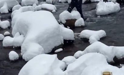 Trabzon’da yöresel ürünler üreten işletme sahibi İbrahim Muratoğlu, kar yağışı ve soğuk havaya rağmen ürününü alışılmadık bir yöntemle tanıttı. Muratoğlu, tanıtım görüntülerinde kıyafetleriyle buz gibi dereye girerek ürününün doğallığına dikkat çekti.