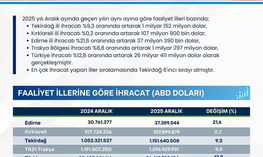 Açıklanan rakamlar, yılın son ayında Trakya'da sanayi, tarım ve lojistik faaliyetlerinin dış ticarete güçlü katkı sunduğunu ve özellikle Tekirdağ'ın bölge ekonomisindeki belirleyici rolünü sürdürdüğünü ortaya koydu.