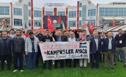 Balkan Yerleşkesi'nde Bolcaana Yemekhanesi önünde toplanan öğrenciler, "Gazze İçin Kampüsler Ayağa" pankartı açarak yürüyüşe başladı. Türk ve Filistin bayrakları taşıyan grup, İsrail aleyhine sloganlar atarak Yaşam Merkezi'ne kadar ilerledi.