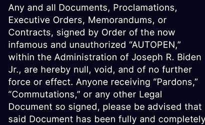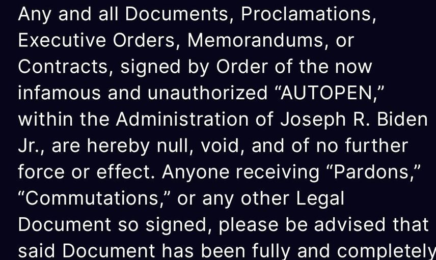 Trump, kendi sosyal medya platformu Truth üzerinden yaptığı paylaşımda, Autopen kullanılarak yetkisiz biçimde imzalandığı iddia edilen "tüm belge, bildiri, yürütme emri, memorandum ve sözleşmelerin" resmen geçerliliğini yitirdiğini bildirdi. Paylaşımında, "Af, ceza indirimi veya bu şekilde imzalanmış başka bir belge alan herkes söz konusu belgenin hiçbir yasal etkisinin olmadığını unutmamalıdır" ifadelerine yer verdi.