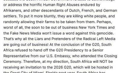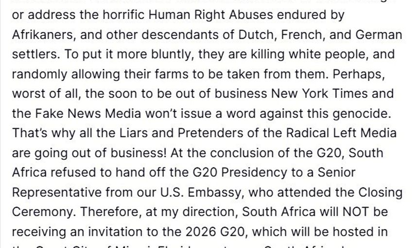 Kendisine ait Truth platformundan paylaştığı mesajda Trump, Güney Afrika hükümetinin Afrikanerler ile Hollanda, Fransız ve Alman kökenli diğer yerleşimcilerin maruz kaldığı insan hakları ihlallerini kabul etmeyi veya ele almayı reddettiğini savunarak, "ABD bu yüzden Güney Afrika’daki G20 toplantısına katılmamıştır" hatırlatmasında bulundu.