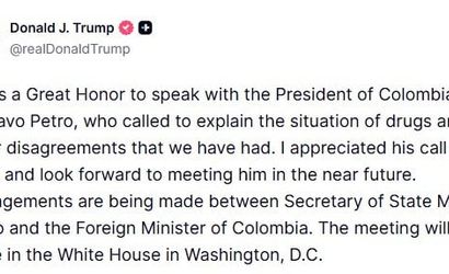 ABD Başkanı Donald Trump, Kolombiya Devlet Başkanı Gustavo Petro ile bir telefon görüşmesi gerçekleştirdiğini duyurdu. Trump, Truth platformundan paylaştığı açıklamada Petro’nun uyuşturucu sorunu ve iki ülke arasındaki diğer anlaşmazlıklara ilişkin tutumunu aktarmak için kendisini aradığını söyledi.