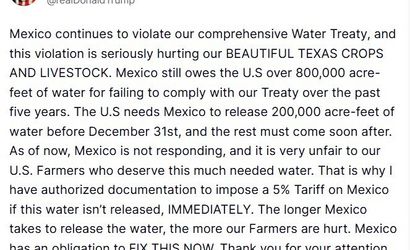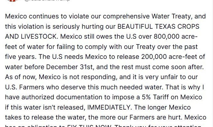 Açıklamada, Meksika'nın son dönemde anlaşmaya uymadığı ve bunun Teksas bölgesindeki ürünler ile hayvancılığı ciddi şekilde etkilediği öne sürüldü. Trump, Meksika'nın "son 5 yılda anlaşmaya uymadığı için ABD’ye 800 bin akre-fit’ten fazla su borçlu" olduğunu belirtti ve "ABD’nin, 31 Aralık’tan önce Meksika’nın 200 bin akre-fit suyu serbest bırakmasına ihtiyacı var; geri kalanı da çok geçmeden sağlanmalıdır" diye ekledi.