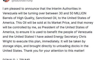 ABD Başkanı Donald Trump, Venezuela’daki geçici yönetimin yaptırım altındaki 30 ila 50 milyon varil arasında yüksek kaliteli petrolü ABD’ye devredeceğini açıkladı. Trump, bu ham petrolün piyasa fiyatından satılacağını ve satıştan elde edilecek gelirlerin kontrolünün kendisinde olacağını belirtti.