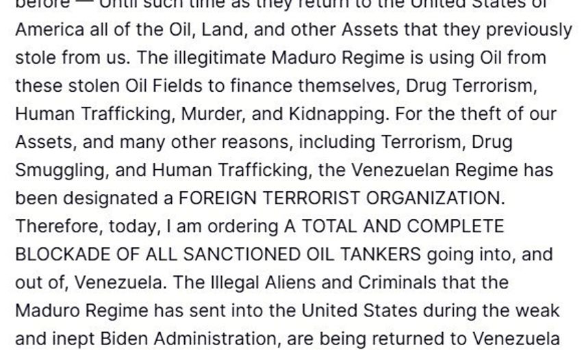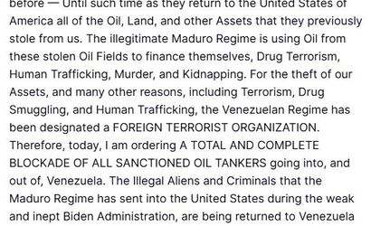 ABD Başkanı Donald Trump, Truth sosyal medya platformundan yaptığı açıklamada Venezuela rejiminin "Yabancı Terör Örgütü" olarak tanımlandığını duyurdu. Trump, "Venezuela’ya giren ve Venezuela’dan çıkan tüm yaptırıma tabi petrol tankerlerine tam ve kapsamlı bir abluka emri veriyorum" ifadelerini kullandı.