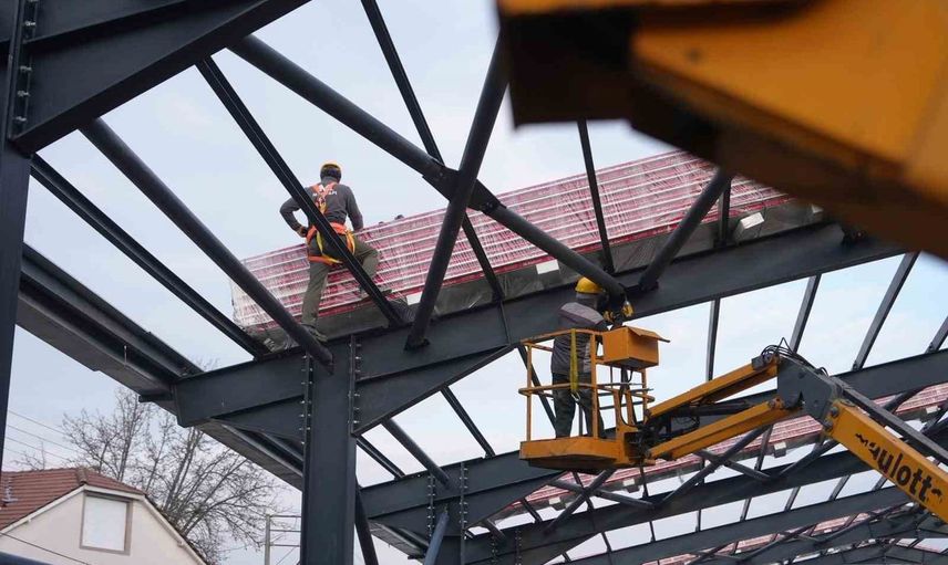 Çelik konstrüksiyon sistemi üzerine inşa edilen yapının çatısı tamamen sandviç panel ile kapatılıyor. Zeminde ise beton serimi çalışmaları devam ederek pazaryerinin kullanım koşullarını sağlamaya yönelik hazırlıklar yapılıyor.