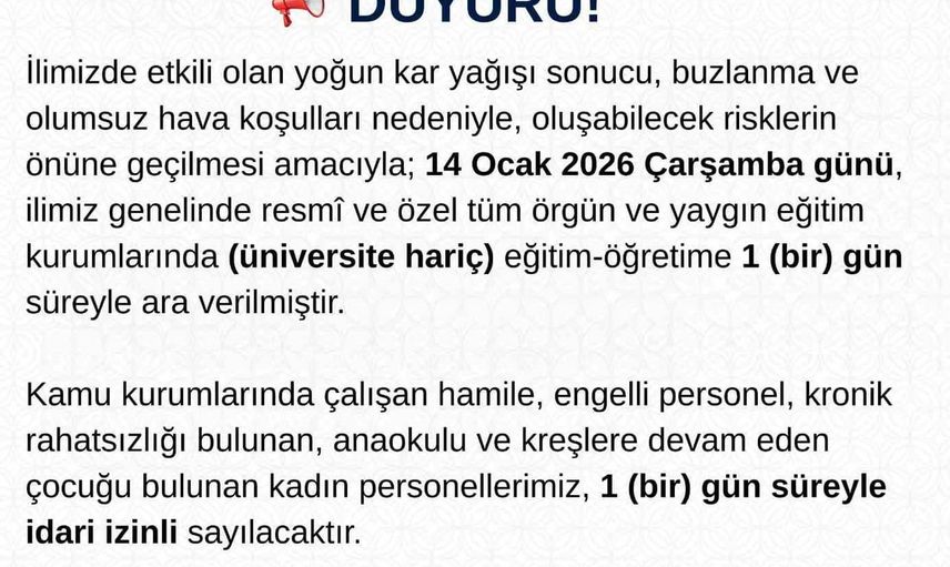 Personel düzenlemesi: Valilik ayrıca kamu kurumlarında görev yapan; hamile ve engelli personel, kronik rahatsızlığı bulunan çalışanlar ile anaokulu ve kreşlere devam eden çocuğu olan kadın personelin 1 gün idari izinli sayılacağını açıkladı.