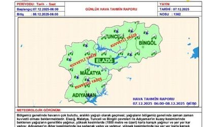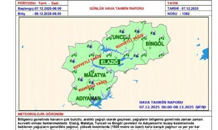 "Bölgemiz genelinde beklenen kuvvetli yağışların, Elazığ, Malatya, Tunceli ve Bingöl çevreleri ile Adıyaman’ın kuzey kesimlerinde kuvvetli yağmur yüksek kesimlerinde ise (Bin 500 metre rakım üzeri) kuvvetli karla karışık yağmur ve kar yağışı beklenmektedir. Bu nedenle oluşması beklenen ani sel, su baskını, ulaşımda aksamalar, kar yağışı olan yerlerde buzlanma ve don olayı, yağış anında kuvvetli rüzgar ve tipi gibi olumsuzluklara karşı dikkatli olunmalıdır" denildi.