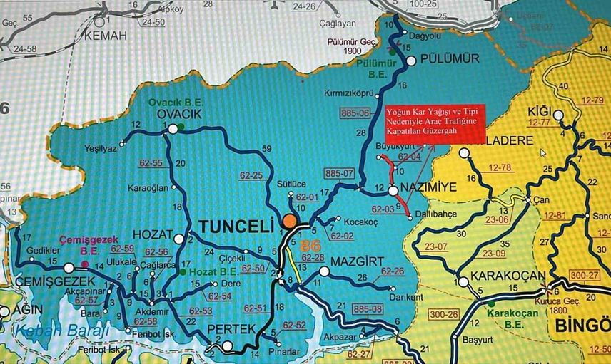 62-25 KK No'lu Tunceli-Ovacık-Yeşilyazı İl Yolu (62-73 km): Yoğun kar yağışı ve tipi nedeniyle görüş mesafesinin kısıtlanması sonucu saat 16.30 itibarıyla araç trafiğine kapatıldı.
