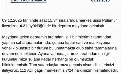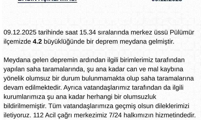 "09.12.2025 tarihinde saat 15.34 sıralarında merkez üssü Pülümür İlçemizde 4.2 büyüklüğünde bir deprem meydana gelmiştir. Meydana gelen depremin ardından ilgili birimlerimiz tarafından yapılan saha taramalarında, şuana kadar can ve mal kaybına yönelik olumsuz bir durum bulunmamakta olup saha taramalarına devam edilmektedir. Ayrıca vatandaşlarımız tarafından da ilgili kurumlarımıza şu ana kadar herhangi bir olumsuzluk bildirilmemiştir. Tüm vatandaşlarımıza geçmiş olsun dileklerimizi iletiyoruz. 112 Acil çağrı merkezimiz 7/24 halkımızın hizmetindedir" denildi. TUNCELİ VALİLİĞİ’DEN DEPREM AÇIKLAMASI: "ŞUANA KADAR HERHANGİ BİR OLUMSUZLUK BİLDİRİLMEMİŞTİR"