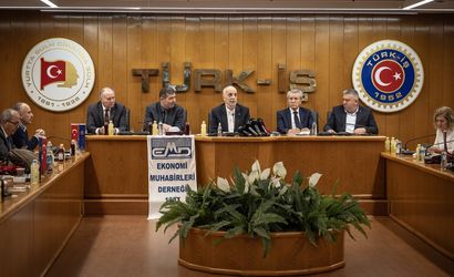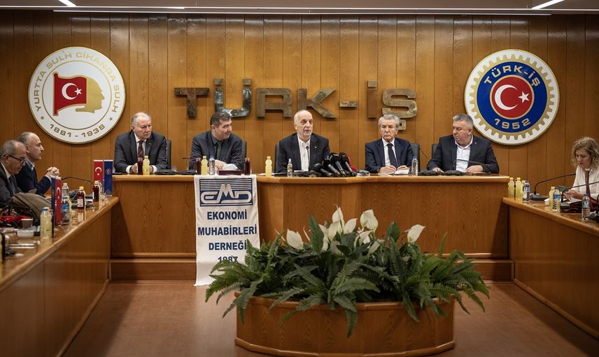 TÜRK-İŞ Genel Başkanı Ergün Atalay, Ekonomi Muhabirleri Derneği (EMD) tarafından TÜRK-İŞ Genel Merkezi'nde düzenlenen basın toplantısında, EMD Başkanı Mehmet Kaya moderatörlüğünde basın mensuplarını sorularını yanıtladı.