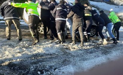 Sinop'un Türkeli ilçesinde, Tümerkan Mahallesi Eşekçi Tepesi istikametinde seyreden bir otomobil, yolda oluşan buzlanma nedeniyle sürücüsünün kontrolünden çıkarak yan yattı.