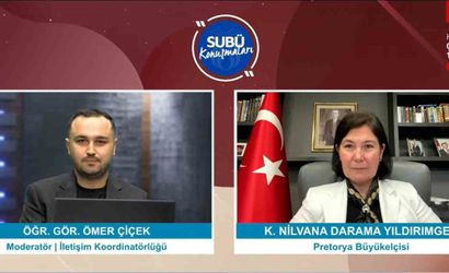 ‘AFRİKA BOYUTUYLA TÜRK DIŞ POLİTİKASI: GÜNEY AFRİKA ÖRNEĞİ’ KONULU SÖYLEŞİYLE SUBÜ KONUŞMALARI’NIN 107’NCİ KONUŞMACISI OLAN PRETORYA BÜYÜKELÇİSİ K. NİLVANA DARAMA YILDIRIMGEÇ, DÜNYAYA GÜNEY’DEN BAKMANIN ZENGİNLEŞTİRİCİ BİR DENEYİM OLDUĞUNU BELİRTEREK TÜRKİYE İLE GÜNEY AFRİKA CUMHURİYETİ ARASINDAKİ TİCARET HACMİNİ 5 MİLYAR DOLARA ÇIKARMAYI HEDEFLEDİKLERİNİ SÖYLEDİ.