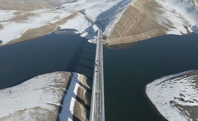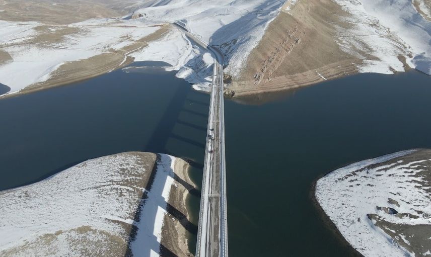 Yoğun kar örtüsü baraj çevresini beyaza boyarken, drone kameraları baraj gölünü ve etrafındaki dağları bembeyaz bir örtünün içinde yakaladı. Görüntülerde köprü, bu sessiz kış peyzajının ortasında zarif bir çizgi gibi uzanıyor.