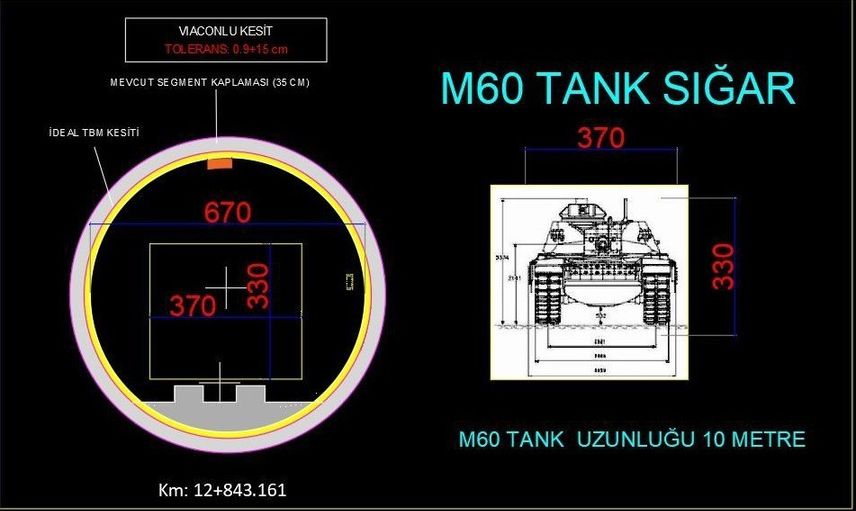 ULAŞTIRMA VE ALTYAPI BAKANI ABDULKADİR URALOĞLU, ÇİFT HATLI DEMİRYOLU TÜNELLERİNİN 2 ADET M60 TANKIN YAN YANA GEÇİŞİNE İMKAN TANIYAN, HATTA BİR F-16 UÇAĞININ SIĞABİLECEĞİ KADAR GENİŞ BİR HACME SAHİP OLDUĞUNU BELİRTTİ.