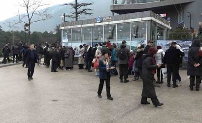 Hafta sonunu Uludağda geçirmek isteyen tatilciler, sabahın erken saatlerinden itibaren teleferik istasyonuna yöneldi. Herkes benzer plan yapınca, teleferik sırasına girenlerin oluşturduğu kuyruk 500 metreyi aştı ve bekleyenler saatlerce teleferiğe binmek için sıra bekledi.