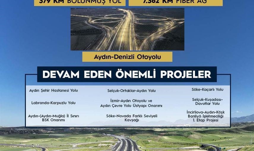 Paylaşılan rakamlara göre son 24 yıllık dönemde Aydın’da 379 kilometre bölünmüş yol tamamlandı ve 7 bin 362 kilometrelik fiber ağ altyapısı kuruldu. Bu yatırımlar arasında Aydın-Denizli Otoyolu, bölgedeki trafik yükünü azaltıp ulaşımı daha güvenli ve konforlu hale getiren önemli projelerden biri olarak öne çıktı.