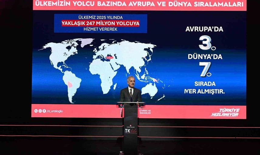 Uraloğlu, 2002'de yaklaşık 34,5 milyon olan yolcu sayısının 2025'te transit yolcularla birlikte 247 milyon 163 bine ulaştığını belirterek "Cumhuriyet tarihinin yeni rekorunu kırdık" dedi. İstanbul Havalimanı'nda üçlü bağımsız pist operasyonu uygulamasının verimliliğe katkısına değinerek, 2025'te toplam 549 bin 319 uçak trafiği gerçekleştiğini ve iç hatlarda 17 milyon 730 bin, dış hatlarda 66 milyon 727 bin olmak üzere 84 milyon 457 bin yolcuya hizmet verildiğini aktardı. Bu rakamla İstanbul Havalimanı'nın Avrupa'da 2'nci, dünya genelinde 7'nci sırada yer aldığını söyledi.