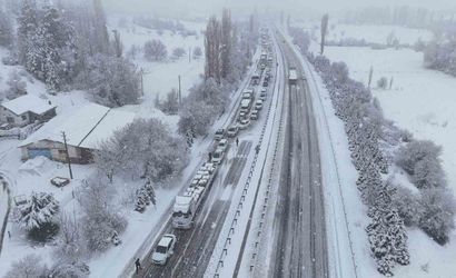 Yaklaşık 3 saat süren çalışmaların ardından yol yeniden trafiğe açılırken, Dumlupınar Rampaları'nda yolda kalan araçlar ve oluşan uzun araç kuyruğu dron ile havadan görüntülendi.